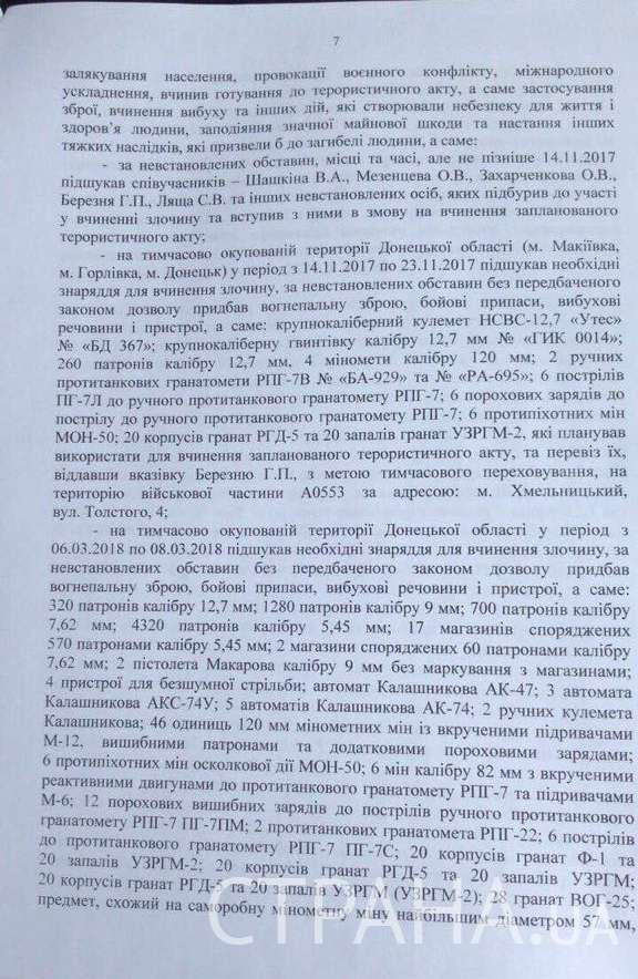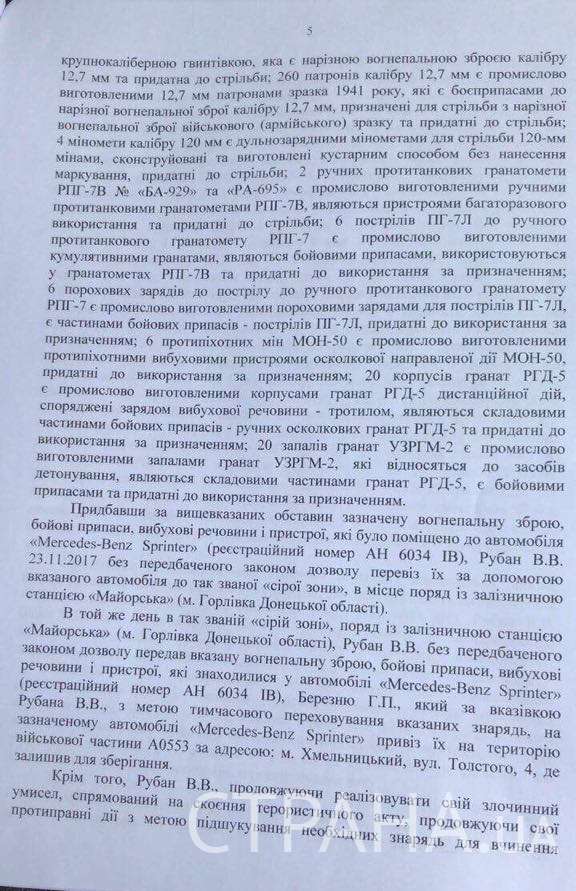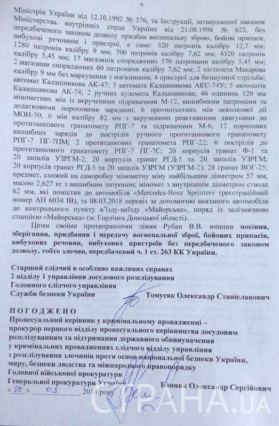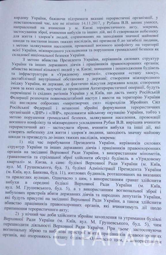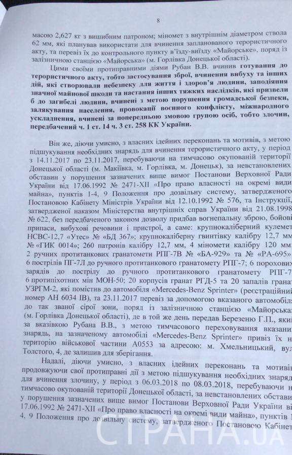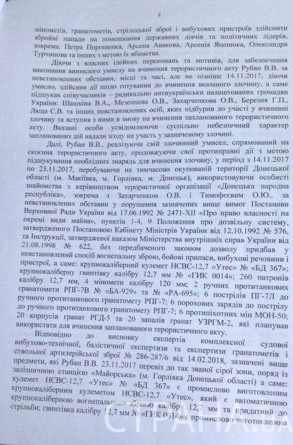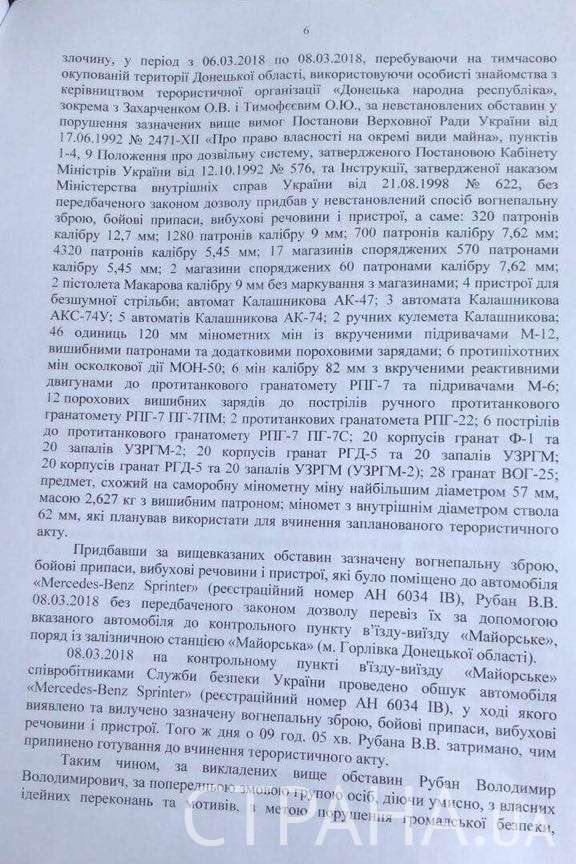 В распоряжении "Страны" оказался текст подозрения Рубану. Публикуем документ полностью. Переговорщику вменяют подготовку террористического акта и незаконное владение оружием. В тексте документа говорится о подготовке покушения на президента Украины, а также на первых лиц государства в Киеве.