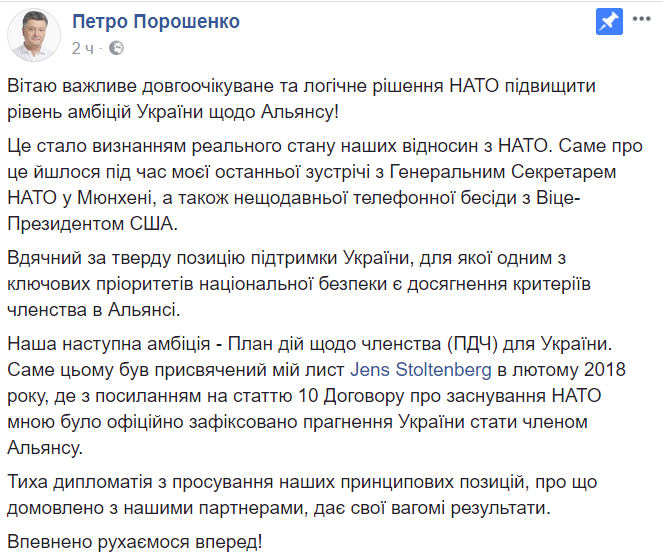 Искренне рад и горд тем, что инициированное мной решение Верховной Рады от 8 июня 2017 относительно членства Украины в НАТО как стратегической цели Украины, стало для этого ключевым импульсом. Мы шаг за шагом, необратимо идем к нашей цели. Украина будет в НАТО!"