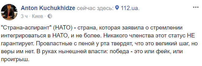 "Страна-аспирант" (НАТО) - страна, которая заявила о стремлении интегрироваться в НАТО, и не более. Никакого членства этот статус НЕ гарантирует. Провластные с пеной у рта твердят, что это великий шаг, но веры им нет. В руках нынешней власти: победа - это или фейк, или проигрыш", - вторит Филипчуку политолог Антон Кучухидзе.