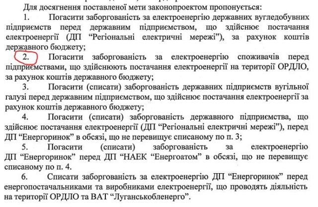 В представленных к законопроекту документах Минэнерго не указывает сумму задолженности потребителей электроэнергии в ОРДЛО. Подтверждение задолженности будет осуществлять межведомственная комиссия, которую создаст Кабмин. Также предложено списать задолженность ГП "Энергорынок" перед поставщиками электроэнергии в ОРДЛО.