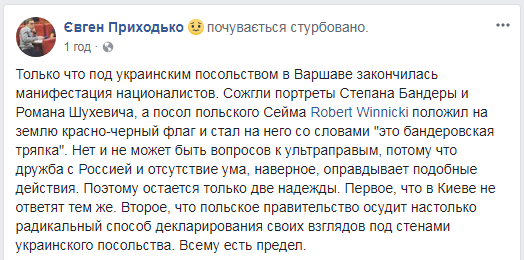 "Нет и не может быть вопросов к ультраправым, потому что дружба с Россией и отсутствие ума, наверное, оправдывает подобные действия. Поэтому остается только две надежды. Первое, что в Киеве не ответят тем же. Второе, что польское правительство осудит настолько радикальный способ декларирования своих взглядов под стенами украинского посольства. Всему есть предел", - написал он в своем Facebook.