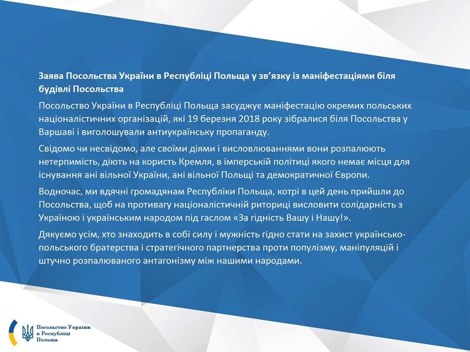 "Сознательно или бессознательно, но своими действиями и высказываниями они разжигают нетерпимость, действуют в интересах Кремля", — заявили в посольстве Украины в Польше.