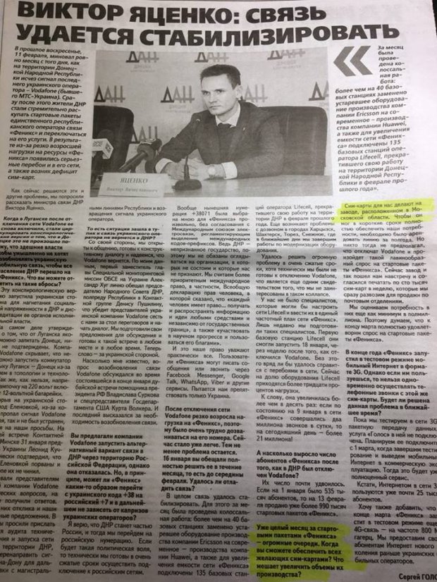 "Ну не могу удержаться и не поделиться новостями из печатных изданий "государства" морячка Захарченко. Действительно, эта "страна"создана больным человеком. Ключевая новость в этом информационном мусоре – из-за отсутствия мобильной связи организуются мобильные туры по местам, где есть покрытие Vodafone. Стоимость "тура" – от 200 до 250 рублей", – говорится в сообщении.