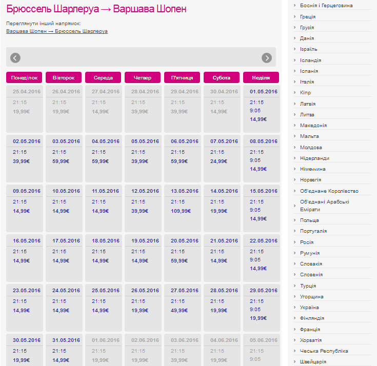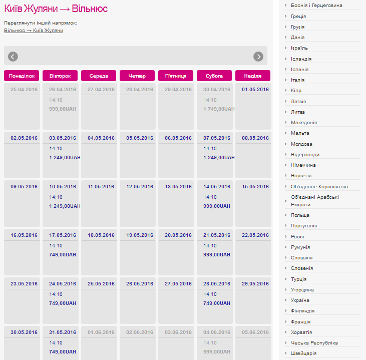 Популярное направление Киев - Вильнюс - Киев, цены на май - стартовали от 749 гривен (17 мая), вернуться можно заплатив от 720 гривен (21 мая), а Варшава - Шарлеруа - Варшава обойдется от 410 гривен.