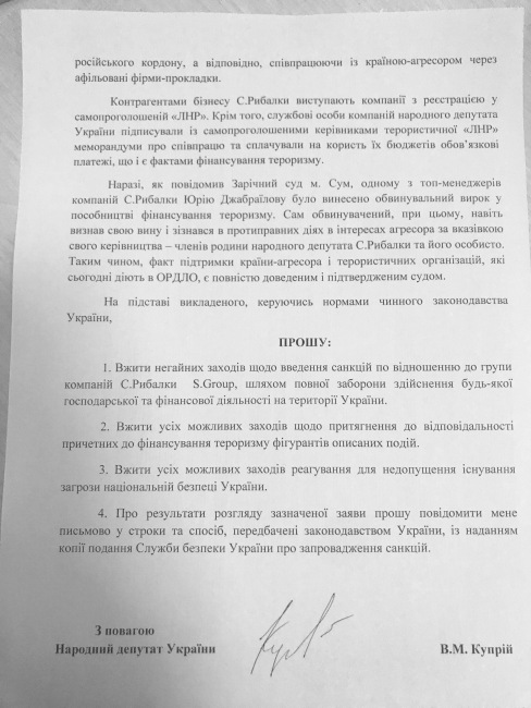 «Контрагентами бизнеса С.Рыбалки выступают компании с регистрацией в самопровозглашенной «ЛНР». Кроме того, должностные лица компаний народного депутата Украины (Рыбалки, – ред.) подписывали с самопровозглашёнными руководителями террористической «ЛНР» меморандумы о сотрудничестве и платили в пользу их бюджетов обязательные платежи, что и есть фактом финансирования терроризма», – уточнил Куприй.