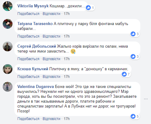 «А плиточку в парке у фонтана пожалуй забрали…», «Жаль, коров вырезали по селам, нет теперь чем ямки замазать…», «Кошмар… дожили…», «Плиточки в ямку, а «денюшку» в кармашек», «Новейшие технологии. Називается — собери мозаику», — пишут в комментариях.