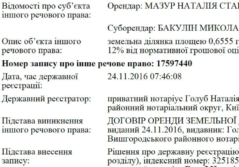 Итак, Наталья Мазур, совладелица доли в уставном капитале ООО «Дельта Строй», размер взноса составил 600 тыс. грн. В соответствии с выпиской из реестра вещных прав, 24.11.2016 года она получила у Вышгородской районной государственной администрации в долгосрочную аренду на 49 лет земельный участок площадью 65 соток в Хотяновской сель раде Вышгородсокго района Киевской области. Этот участок Наталья Мазур через неделю передала в субаренду на те же 49 лет некоему Николаю Евгеньевичу Бакулину. Казалось бы, ничего нет крамольного, обычные гражданские правоотношения между физическими лицами.