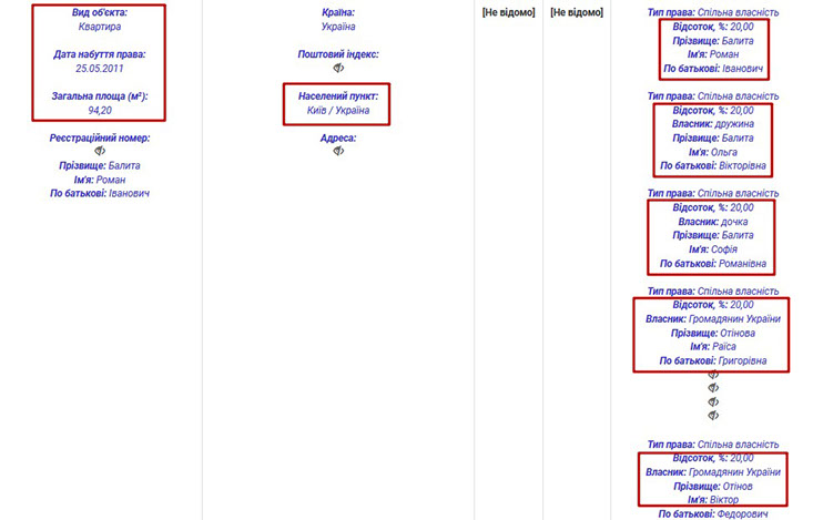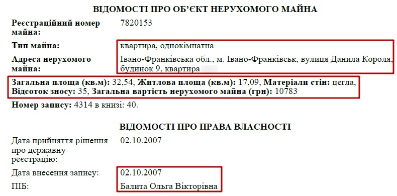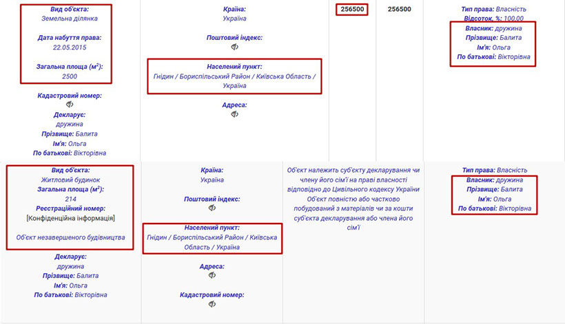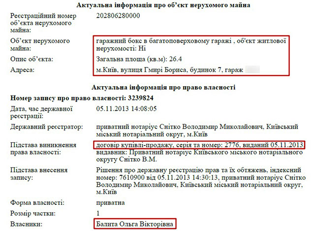 Власником решти задекларованого майна є дружина прокурора – Ольга Вікторівна Балита.Зокрема, вона володіє гаражним боксом у Києві, за адресою вулиця Бориса Гмирі, 7. Також у її власності квартира в Івано-Франківську.