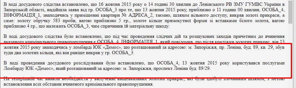 Или вот: «…повідомив, що після крадіжки золотих прикрас, він 13 жовтня 2015 року знаходячись у ломбарді ЮК «Демос», що розташований за адресою: м. Запоріжжя, пр. Леніна, буд. 89, кв. 29, збув туди два золотих кільця, які він раніше викрав у гр. ОСОБА_3».