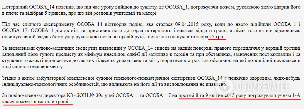 Главарем группы был девятиклассник. Однажды парень вместе с товарищем затащил в школьный туалет малолетнего школьника. Ребенка несколько раз ударили рукояткой ножа в плечо, после чего забрали пять гривен.