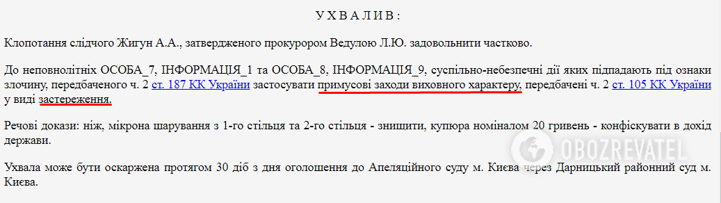Полиция задержала налетчиков. В связи с тем, что юные злоумышленники не достигли возраста наступления уголовной ответственности по ст. 187 ч.2 УК Украины (разбой), суд применил к ним "принудительные меры воспитательного характера, предусмотренные ст. 105 ч.2 УК Украины (освобождение от наказания) в виде предостережения".