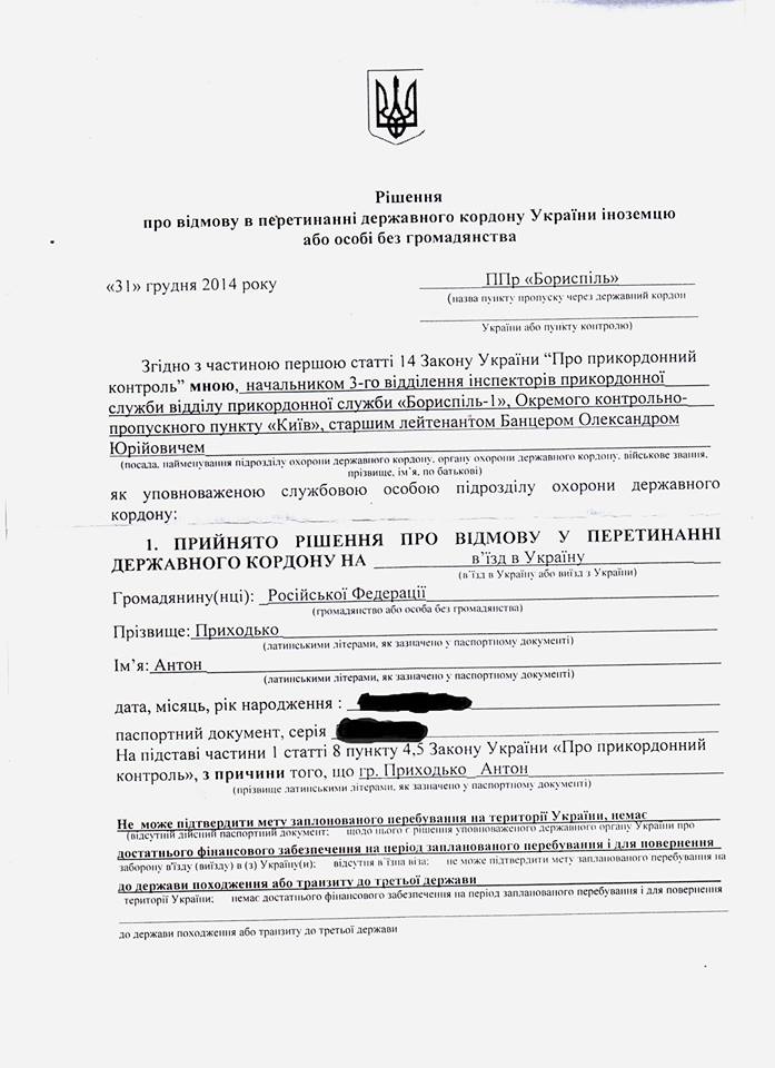 - Когда мой хороший московский друг, Антон Приходько, огорченно заметил, что его не впустили на Украину 31 декабря 2014 года, я слегка как бы это сказать... офигел. И не потому, что не в курсе, что периодически Украина отказывает во въезде гражданам России, а скорее из-за абсолютного абсурда применительно непосредственно к Антону. Взрослый, солидный человек, ни капли не разболбай и не дауншифтер, ведущий специалист в очень крупной компании. Но главное даже не это. В России трудно сыскать в наши дни более спокойного и разумно мыслящего человека, который на протяжении конфликта на Донбассе постоянно в кругу друзей и в интернете призывал всех опомниться, не позволить себе превратиться в агрессивное быдло трясущееся от зомбоящика. Также, мы с ним согласны насчет незаконности отторжения Крыма от Украины, пусть даже и с учетом того, что исторических прав на Севастополь у россиян куда больше, чем у современной Украины. Так и на Аляску у России исторических прав больше, чем у США, так что, Путин не пытался вернуть Аляску только из-за страха получить отпор?