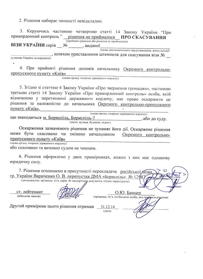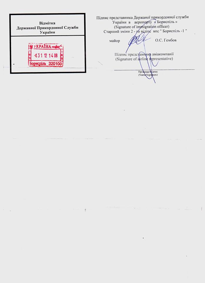 Прикиньте абсурд ситуации, когда Антона, который намеревался провести Новый год в кругу друзей в Киеве, вдруг взяли и не впустили в страну. Неуважаемые начальник пограничной смены Борисполя, майор Гембов и такой же бездарь, старший лейтенант Банцер (из-за таких как вы, пан Банцер – евреев не любят), я про вас второй раз слышу. В первый раз вы вымогали у себя в кабинете сто долларов у знакомой 59-летней тетеньки, утверждая, что она едет воевать в ополчение, затем, в процессе пересчета ее наличных денег, "замылили" сотню. А когда тетенька поймала вас на воровстве – оформили депортацию за несговорчивость. Поразительно, но этот самый Банцер, по словам тетеньки, потом к ней подходил и снова имел наглость предложить "уладить вопрос", даже несмотря на уже выданный документ о депортации. Полагаю, что подобные случаи далеко не единичны. Эти два деятеля (Гембов и Банцер) обычно дежурят в одной смене.