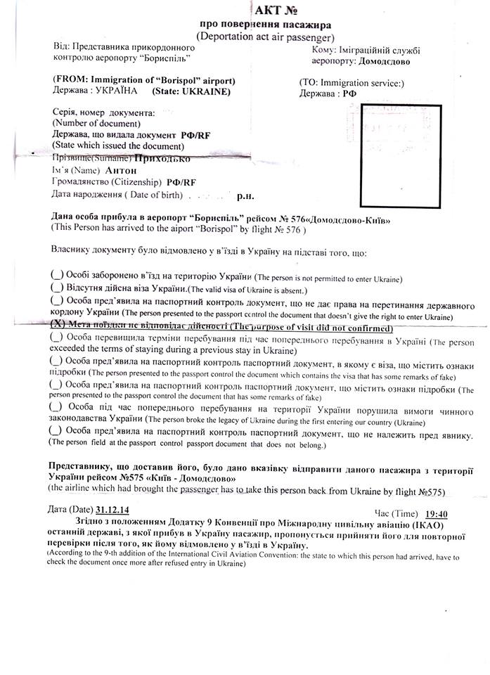 Через три с половиной часа меня пригласили и сказали, что мне отказано во въезде в Украину по причине отсутствия средств на проживание и подтверждения места проживания. Меня отвели в загон в другом конце зала и я там просидел до вечернего рейса в Москву.