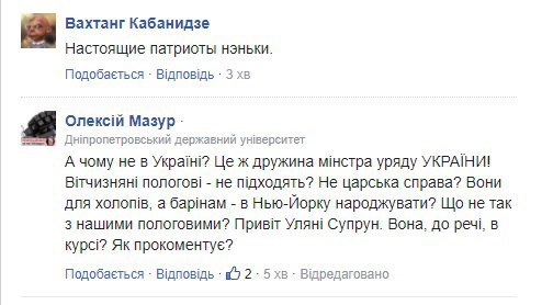 Комментаторы в соцсетях возмущены решением пары рожать в США: «Настоящие патриоты неньки», «А почему не в Украине? Это же жена министра правительства Украины! Отечественные роддома не подходят? Не царское дело? Они для холопов, а барінам в Нью-Йорке рожать? Что не так с нашими родильными?».