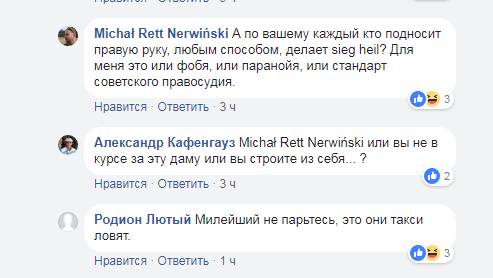 "Конечно это не нацистское приветствие. Это они показывают, что хотят видеть Украину вот такой европейской", "Милейший, не парьтесь, это они такси ловят", - иронично написали другие пользователи.