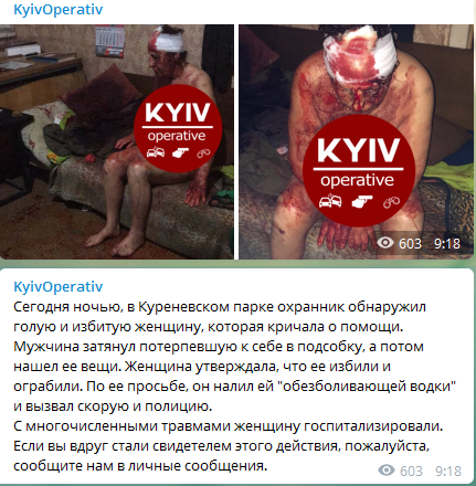 Ночью 24 апреля в Куреневском парке Киева охранник обнаружил голую и избитую женщину, которая кричала о помощи.