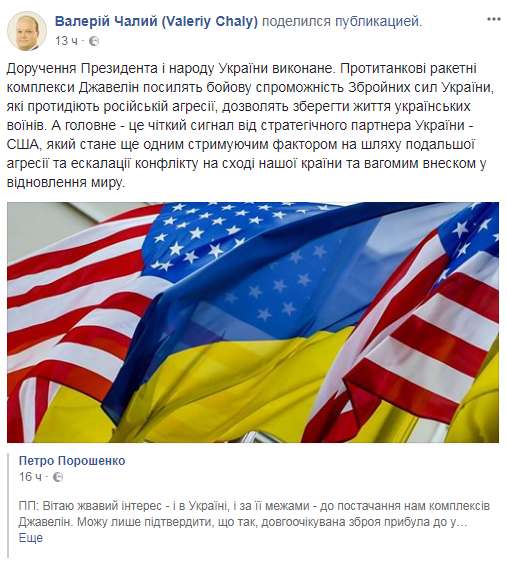 Соединенные Штаты Америки доставили в Украину противотанковые комплексы Javelin. Эту информацию подтвердил и президент Украины Петр Порошенко.