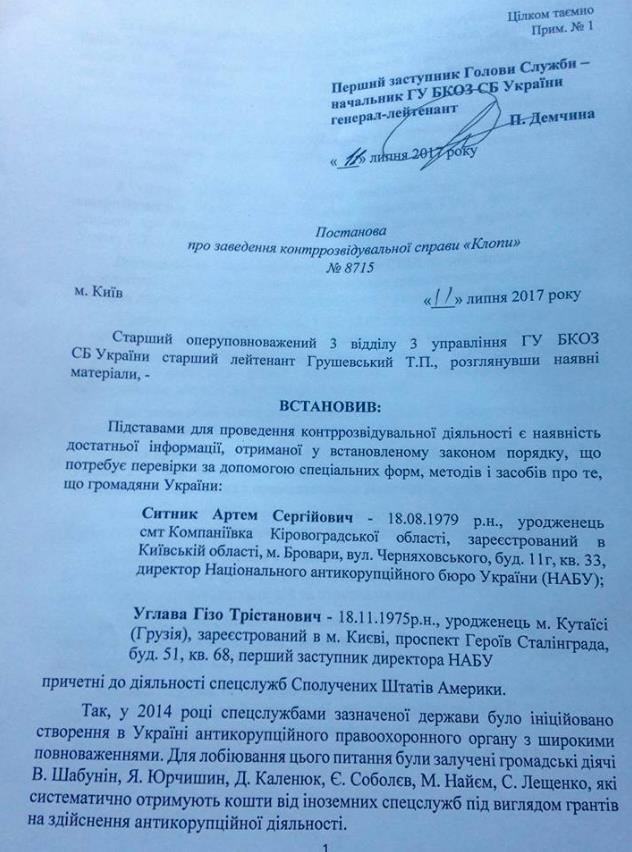 Родзинкою поширеного Речинським цілком таємного документу було те, що в ньому П.Демчина особисто санкціонував заведення справи на керівників НАБУ – панів Артема Ситника та Гізо Углаву.