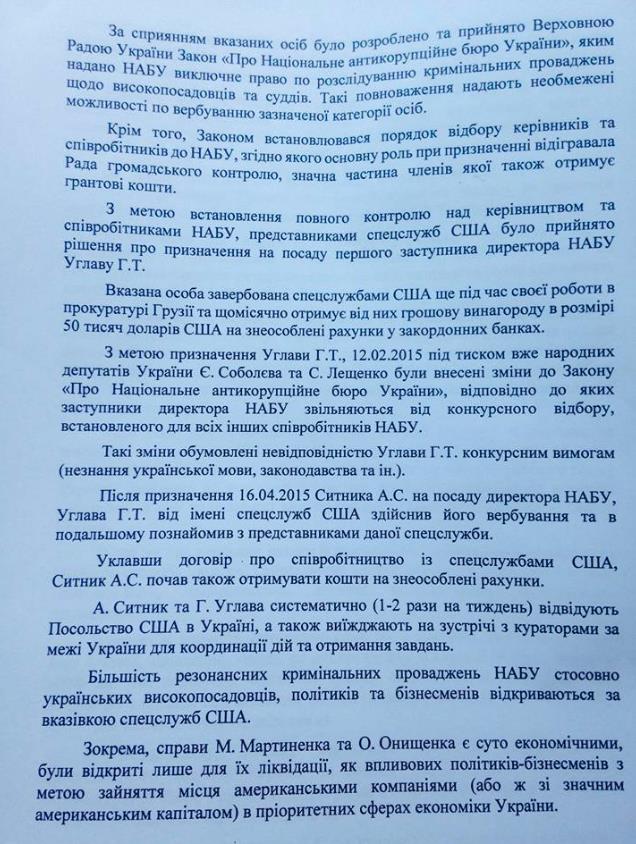 Фактично іноземні фінансово-промислові кола або простіше – іноземні олігархи мали намір через НАБУ отримати контроль за нашої державою. Відповідно для іноземних олігархів конче потрібно вибудувати нову структуру влади, яка має підточити стрижень державності та надати преференції більш лояльним представникам українського політикуму. Для реалізації своїх цілей іноземні донори використали досить популістський лозунг боротьби з корупцією в Україні, кілька "ручних" горлопанів (їх прізвища наведені у публікації Речинського) та новостворений орган державної влади, який дублює функції кількох вже існуючих – НАБУ.