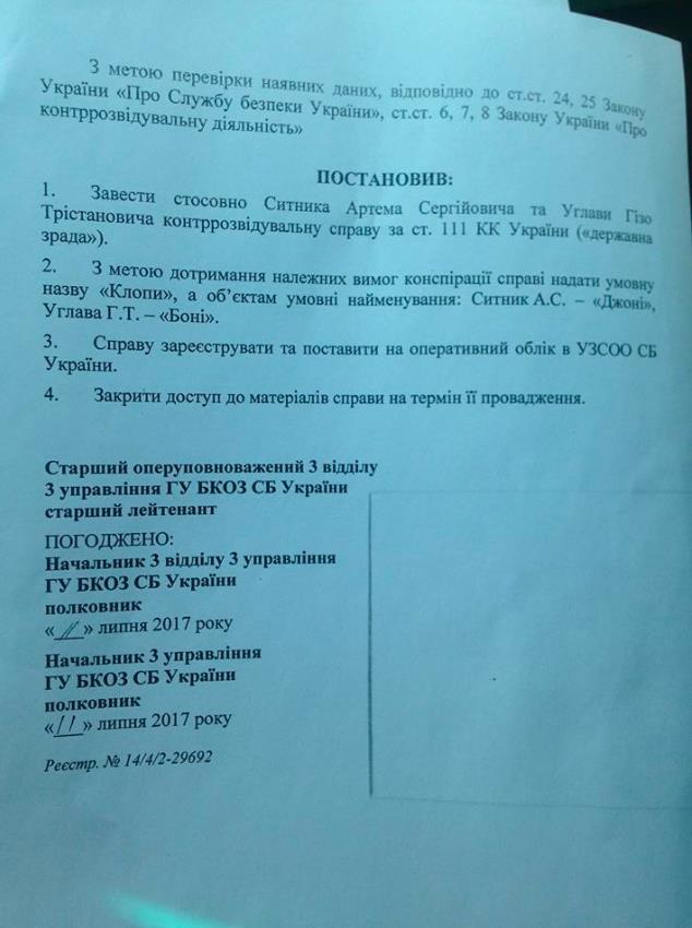 За інформацією, отриманою від інсайдерів, справа щодо Ситника та Углави в СБУ все ж таки ведеться. І обізвали їх дійсно «клопами». Постанова, що була викладена в Інтернет Речинським – «фейкова», її мета - привернути увагу до проблеми та одночасно убезпечити автора від кримінального переслідування за розголошення матеріалів. Цілі абзаци в документ Речинського перекочували з реальної справи контррозвідувальної перевірки «Клопи».