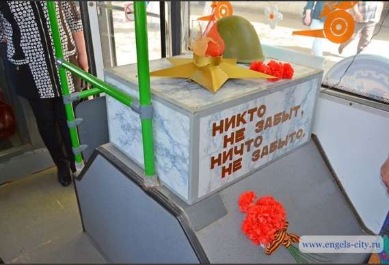 В г. Энгельс на линию вышел троллейбус с макетом могилы Неизвестного солдата, Вечным огнем и водителем в гимнастерке. pic.twitter.com/IldWCGqKgp
