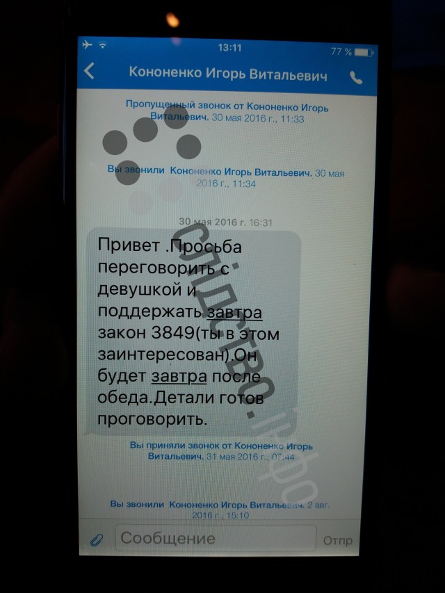 Кроме того, Онищенко рассказал о том, как 13 марта 2015 года получил сообщение от Сергея Березенко с просьбой пообщаться с Тимошенко для поддержки градостроительного закона.