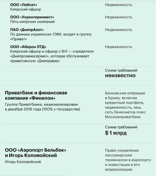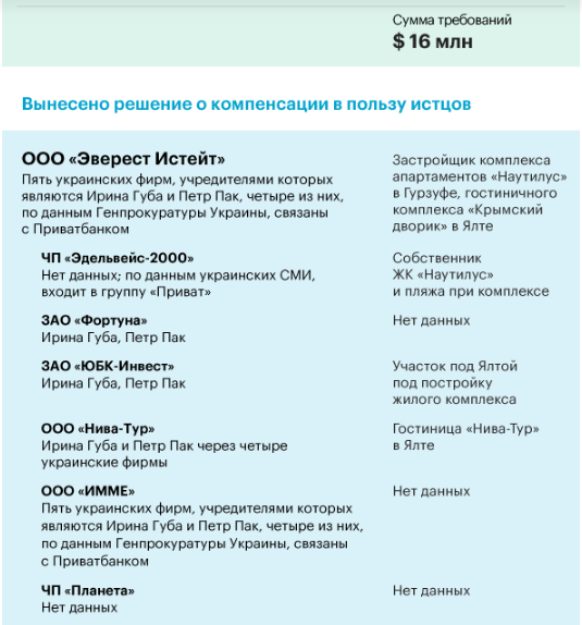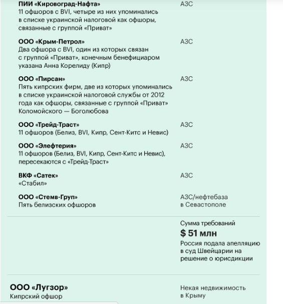 По данным СМИ, конечными бенефициарами этих компаний является Коломойский и Геннадий Боголюбов.