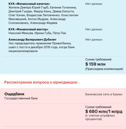 Речь идет о принятии решения по иску ООО "Эверест Истейт" и 17 других украинских структур, а также одного физлица - бывшего председателя правления ПриватБанка Александра Дубилета, пишет РБК.
