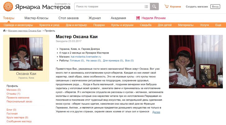 Гадалка называет себя Оксана Каи. Она занимается изготовлением кукол-оберегов, которые тесно связанные с магическими ритуалами на плодородие, сохранение здоровья, продолжение рода, а также охраняет своих хозяев от злых сил и приношение им благосостояние.