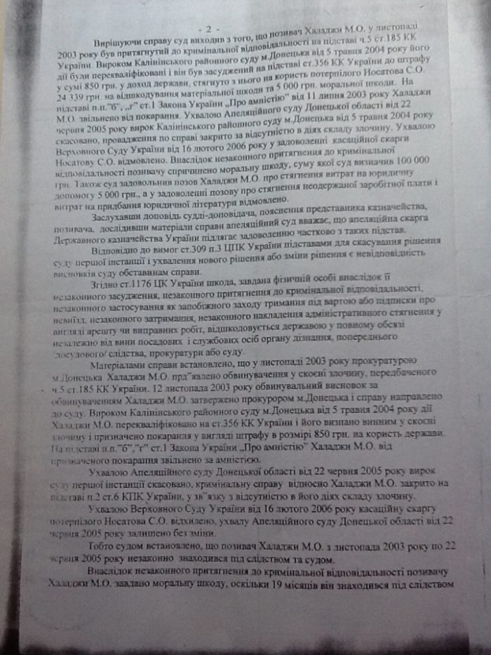 Рішенням Апеляційного суду Донецької області від 12 лютого 2007 року у справі №22-1608/2007, яким за рахунок державного бюджету Михайлу Халаджі була виплачена компенсація за злочин, вчинений відносно нього нинішнім членом Громадської ради при Державному бюро розслідувань