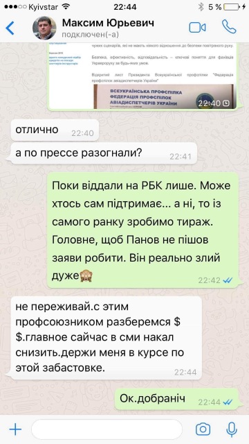 Из текста переписки следует, что Бурбак и директор ГП «Украэрорух» Дмитрий Бабйечук силой заставили главу Всеукраинской федерации профсоюзов авиадиспетчеров Украины Панова подписать письмо на имя министра инфраструктуры Владимира Омеляна о том, что «возможность проведения забастовки авиадиспетчерами Украэрорух» якобы даже не обсуждалась.
