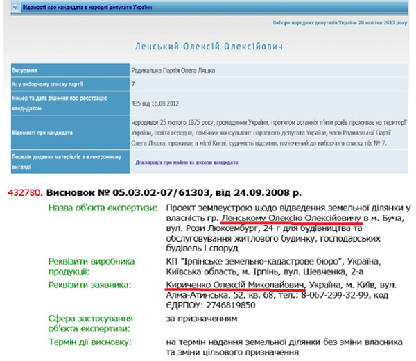 На сайті МОЗ України вказано, що ділянку в Бучі по вулиці Рози Люксембург отримав лідер радикальної партії Олег Ляшко.
