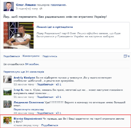 На телефонні дзвінки та SMS він не відповідає. Спробували через Facebook, але запитання стосовно землі в Бучі були видалені або модератором, або й самим Ляшком в короткий термін.