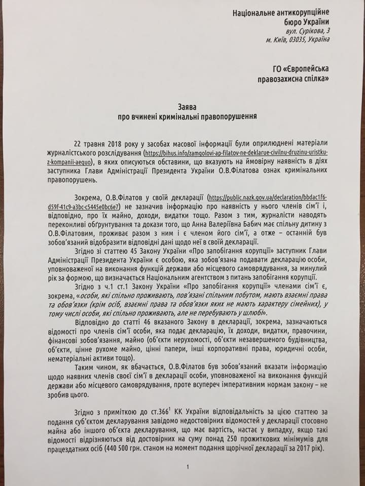 В Национальное антикоррупционное бюро Украины (НАБУ) подано заявление о совершении уголовных преступлений заместителем главы Администрации президента Алексеем Филатовым.