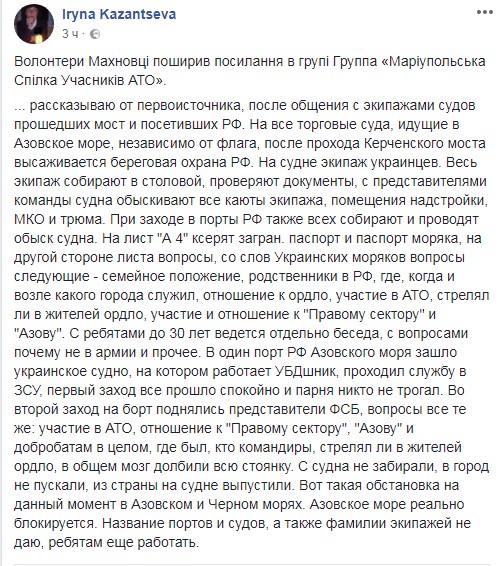Кроме того, пользователь Ирина Казанцева в Facebook рассказала об обысках украинских судов, которые идут в Азовское море. Кроме того, береговая охрана РФ, не стесняясь допрашивает украинских моряков о службе ВСУ и отношении к «Правому сектору» и «Азову».