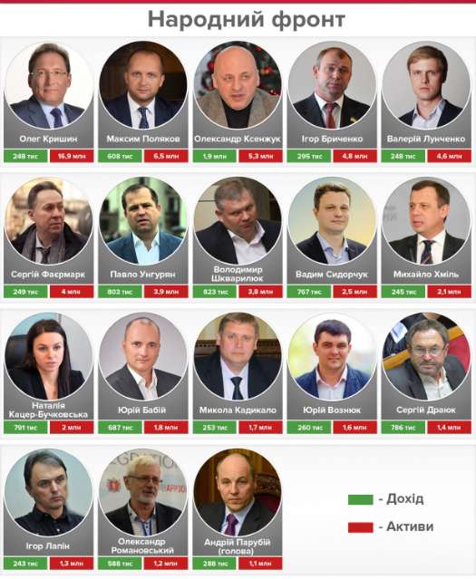 44 из 81 депутата от "Народного фронта" также получили деньги. Из них 18 являются миллионерами. В тройке самых богатых – Олег Кришин (16,9 млн грн), Максим Поляков (6,5 млн грн) и Александр Ксенжук (5,3 млн грн).