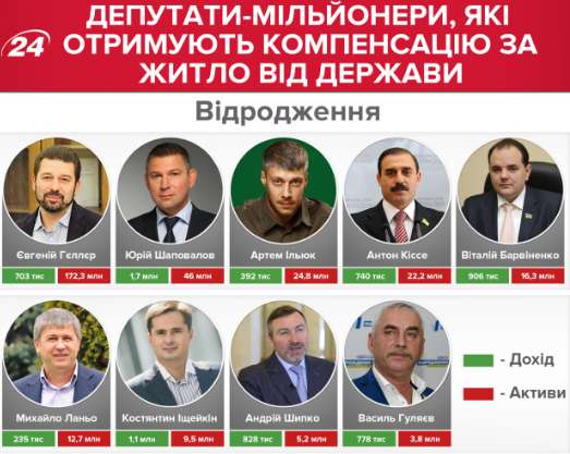 11 депутатов из 26 группы "Возрождение" получают компенсации. Из них 9 – миллионеры. Самые богатые – Евгений Геллер (172,3 млн грн), Юрий Шаповалов (46 млн грн) и Артем Ильюк (24,8 млн грн).