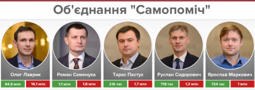 14 из 25 депутатов от "Объединения "Самопомоміч" также живут за госбюджет. Пятеро – миллионеры: Олег Лаврик (14,1 млн грн), Роман Семенуха (18 млн грн), Тарас Пастух (1,7 млн грн), Руслан Сидорович (1,3 млн грн) и Ярослав Маркевич (1 млн грн).