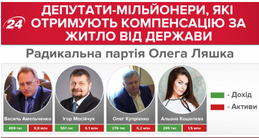7 из 21 человек от фракции Радикальная партия Олега Ляшко снимают жилье за счет государства. Четверо – миллионы: Василий Амельченко (9,8 млн грн), Игорь Мосийчук (6,1 млн грн), Олег Куприенко (5,2 млн грн) и Алена Кошелева (1,5 мон грн).