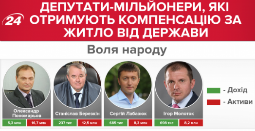 Четыре миллионера от "Воли народа" получают также компенсацию: Александр Пономарев (16,7 млн грн), Станислав Березкин (12,5 млн грн), Сергей Лабазюк (8,3 млн грн) и Игорь Молоток (8,2 млн грн).