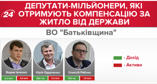 Три депутата-миллионера от ВО "Батьківщина" снимают жилье за счет государства: Вадим Ивченко (3,4 млн грн в активах), Юрий Одарченко (3,3 млн грн) и Алексей Рябчин (1,9 млн грн).