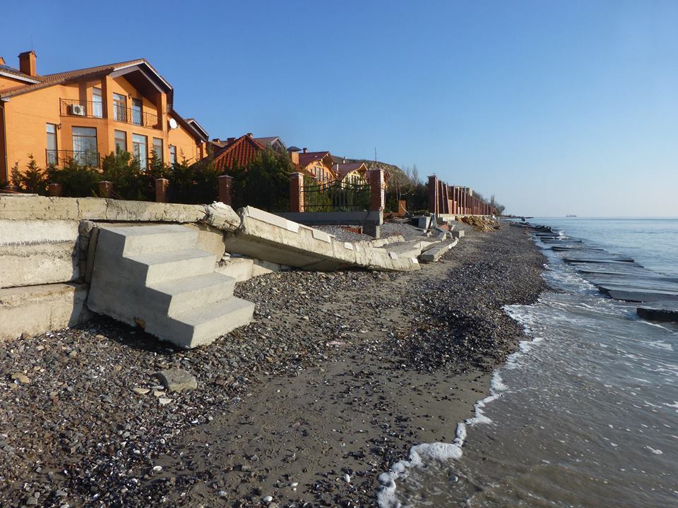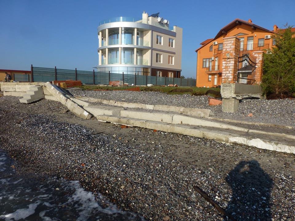 "Море сразу показало свое отношение к этому безобразию – разрушило им заборы и забросало роскошные газоны песком с обломками этих кирпичных заборов. Тогда наши грамотные судьи нашли предельно безграмотного проектировщика берегозащиты и теперь вместо пляжа имеем сплошной бетоный ящик с ракушкой там, где восстановить песчаный пляж было очень просто и с меньшими затратами. Плюс ко всему из-за такого вмешательства сильно размыло соседний участок берега к западу", – написал геолог.