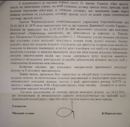 В письме мэр ссылался на приказ No460 от 21.05.2018 Государственной службы Украины по безопасности на транспорте (Укртрансбезопасность) про аннуляцию свидетельства об аттестации Херсонской междугородной автостанции. Таким образом, сделав работу автовокзала фактически невозможной. И это, следует заметить, в начале туристического сезона. По словам заместителя директора ООО «Херсонавтотранс» Назария Ковальчука, такие действия со стороны городских властей не что иное, как прямой ущерб городскому бюджету: «Мы видим последовательные наступательные действия на наш бизнес. На предприятие, которое дает 300 рабочих мест только Херсону, непосредственно. Также мы даем возможность осуществлять коммерческую деятельность нашим арендаторам. Более 20 субъектов хозяйствования у нас арендуют помещения, которые также предоставляют рабочие места и платят налоги. Предприятие является 18-м в рейтинге налогоплательщиков Херсона. Только за 2017 год «Херсонавтотранс» оплатил более 1 728 000 грн налогов», - резюмирует Ковальчук.