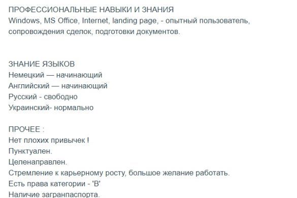 У графі «досвід роботи» він вказав, що працював касиром-продавцем та продавцем-консультантом, заступником керівника в інтернет-магазині, редактором сайту тощо.