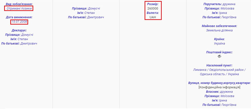 Також у анкеті кандидата на посаду судді Верховного суду йдеться про наявність фінансового зобов’язання, тобто договору позики з фізичною особою від 2008 року. У паперових деклараціях у відповідному розділі інформація про правочин відсутня. Але при заповненні електронних декларацій Степан Домусчі раптово згадує про договір та декларує зобов’язання.