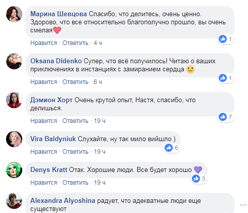 "Спасибо, что делитесь, очень ценно. Здорово, что все относительно благополучно прошло, вы очень смелая", "Супер, что все получилось! Читаю о ваших приключениях в инстанциях с замиранием сердца", "Очень крутой опыт, Настя, спасибо, что делишься", "Мило вышло", "Хорошие люди", "Радует, что адекватные люди еще существуют", - прокомментировали они.