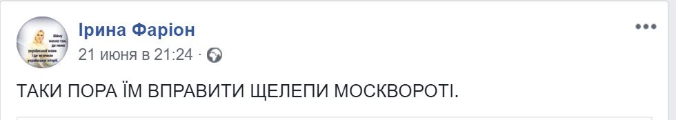 «Если бы украинцы просто ногой давали в челюсть каждому «москворотому», то война бы стала победой давно. А так пока наших бьют. А очень сильно должны бить МЫ», — пишет Фарион, комментируя инцидент с дракой в Мариуполе, где подполковнику Госпогранслужбы сломали челюсть в кафе якобы за просьбу дать меню на украинском языке.