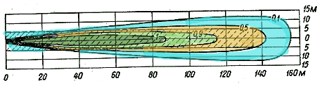 Темно-зеленым цветом показана зона 100% поражения, светло- зеленым 90% зона, коричневым 50% зона и голубым зона с вероятностью поражения 10%.