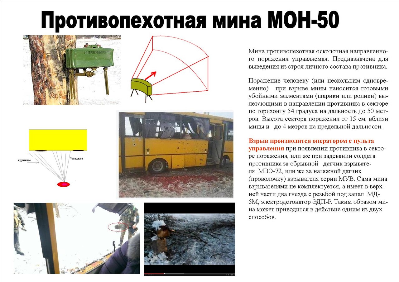 Но принцип, судя по видео и фото, один – мина направленного действия. Глубина поражения осколков, кстати, не выходит за пределы противоположного борта автобуса, ведь взрыв был направлен под углом вверх для более эффективного огня, что можно достичь только с применением МОН 50 либо МОН-100, либо любым сву направленного действия.